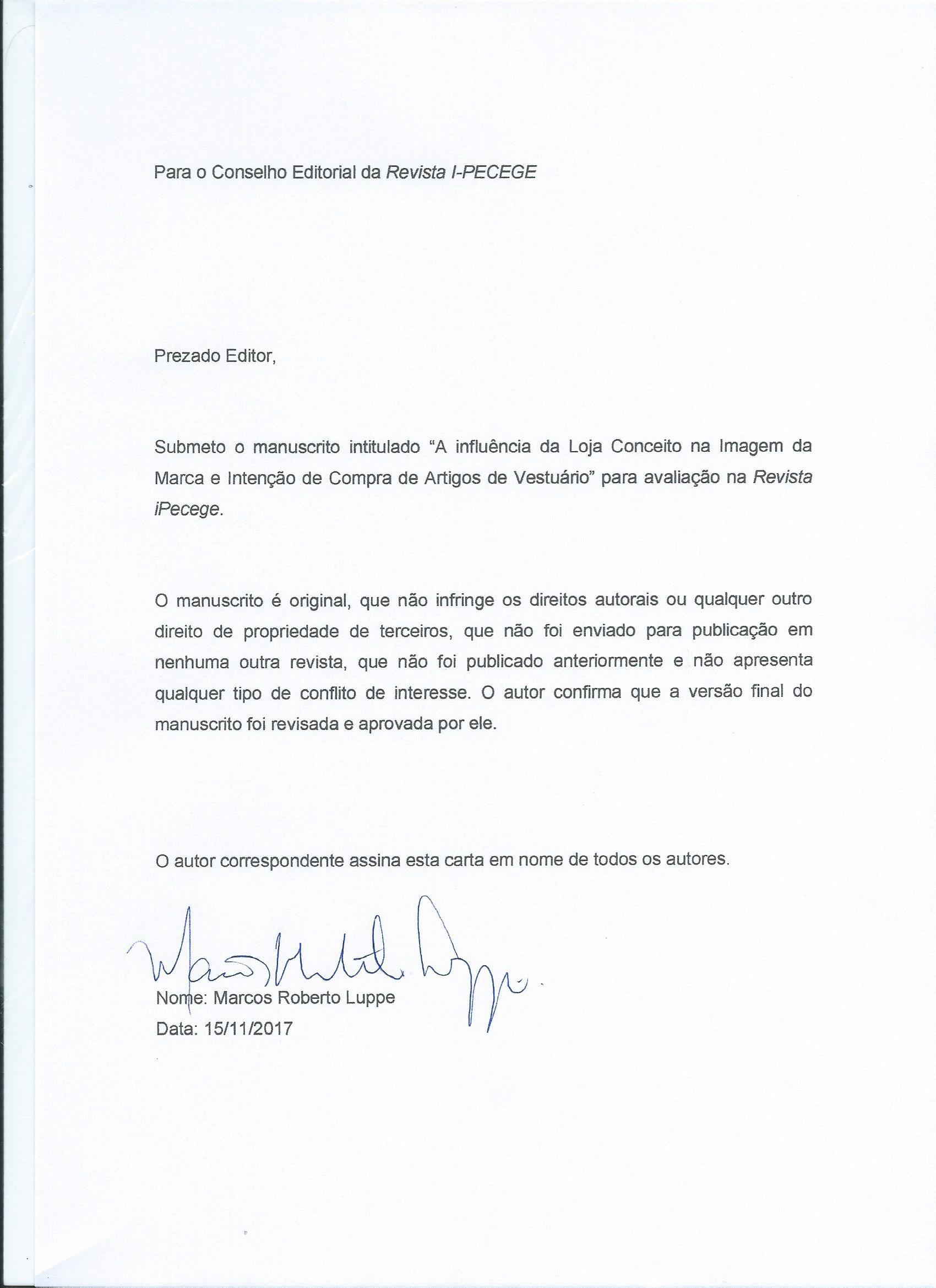 Luppe, M. R., Almeida, A. C. da S., Hirano, N. N., & Aguiar, H. de S. (2018). A influência da loja conceito na imagem da marca e intenção de compra de artigos de vestuário. Revista IPecege, 4(3), 65–72. https://doi.org/10.22167/r.ipecege.2018.3.65