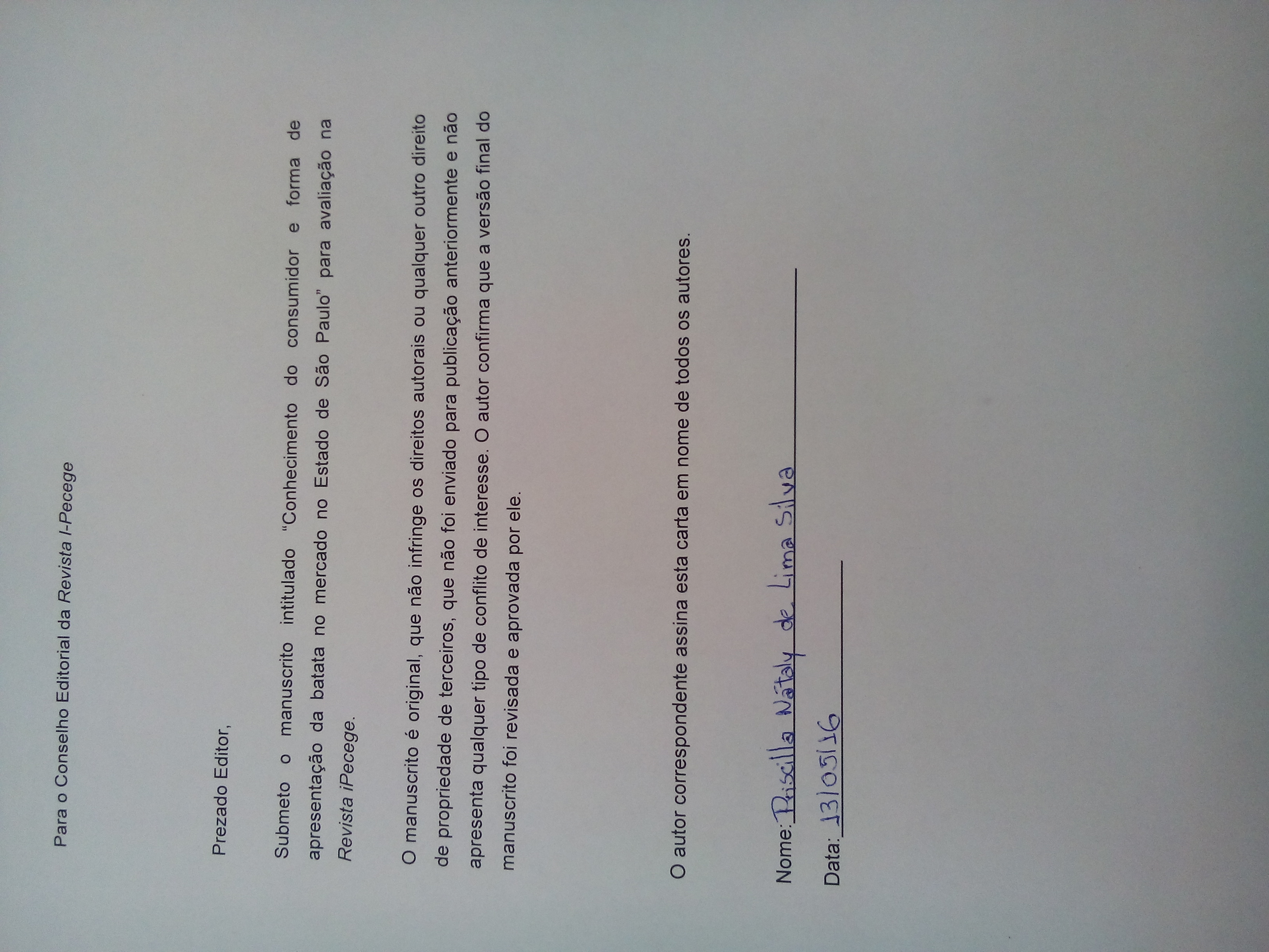 Silva, P. N. L., Fexina Junior, R., & dos Santos, E. F. (2016). Conhecimento do consumidor e forma de apresentação da batata no mercado no Estado de São Paulo. Revista IPecege, 2(2), 46–55. https://doi.org/10.22167/r.ipecege.2016.2.46
